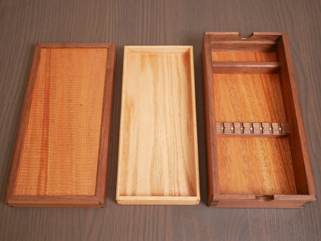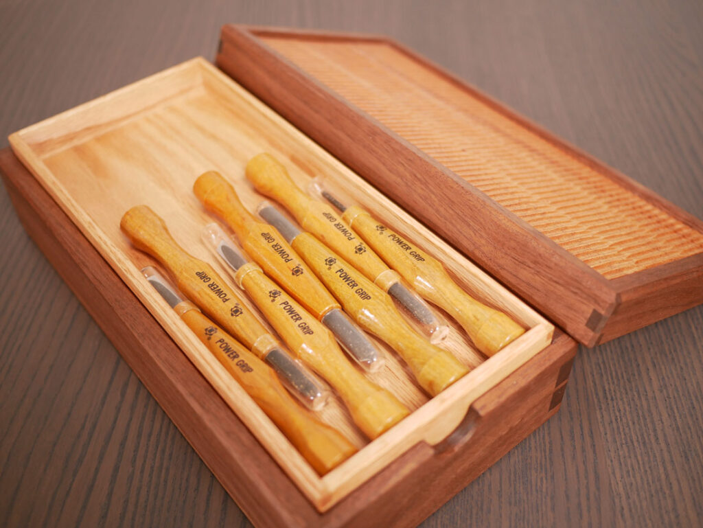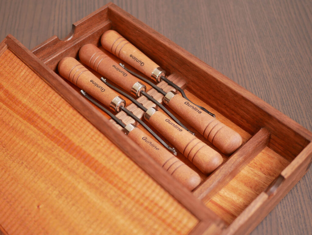 I originally bought a 5-piece set of checkering tools, but one cutter was wobbly. I received a replacement unit, but it turned out to be the wrong one, and then I received another one after that. Since I didn’t need to return them, I ended up with seven tools in total, which didn’t fit in the original box. They’d been sitting in a random box for a while, so I finally made this storage box for them.